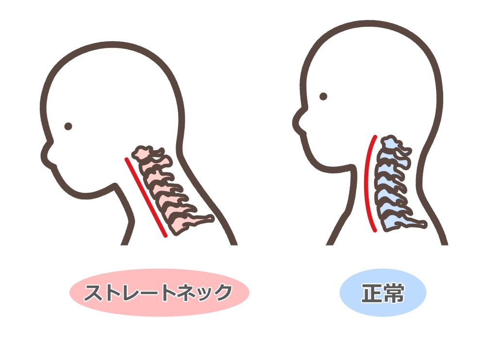 しかし、猫背やうつむいた姿勢が続くことで、このカーブが失われ、頸椎がまっすぐになってしまうのがストレートネックです。